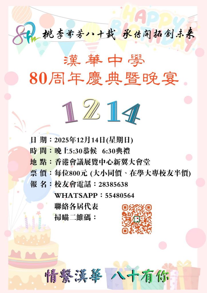 母校即將迎來八十周年華誕,為共慶這一難忘時刻,校友會將在9月16-18日於銅鑼灣中央圖書館3-5展覽館,舉辦 “慶祝漢華中學八十華誕暨紀念抗日戰爭勝利八十周年書畫攝影藝術展”